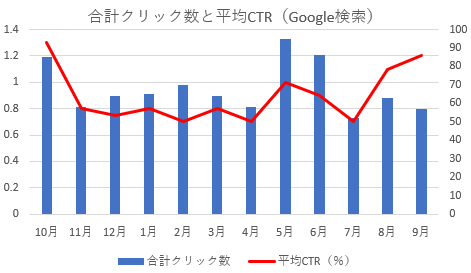 上グラフは、Google Search Consoleデータをベースにグラフ化(2022年10月〜2023年9月) したものです。Google検索によるクリック数と平均CTRを示しています。