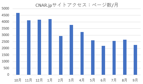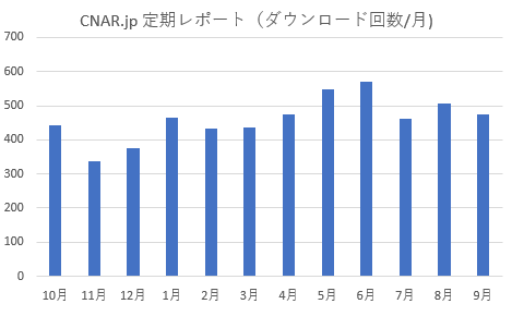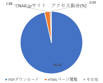 CNAR.jpサイトへのリピータ率(Google Analyticsの新規ユーザ・リピーターで集計している数値)のグラフです。ただし、PDFファイルのカウントを除き、HTMLファイルのみカウントしたリピート率になります。PDFファイルに対するアクセスはダイレクトに来ているのが多いことからリピータのようですが、一方、HTMLファイルのページ(トップページやこのページなど)においては、十数パーセントがリピーターで推移しているようです。